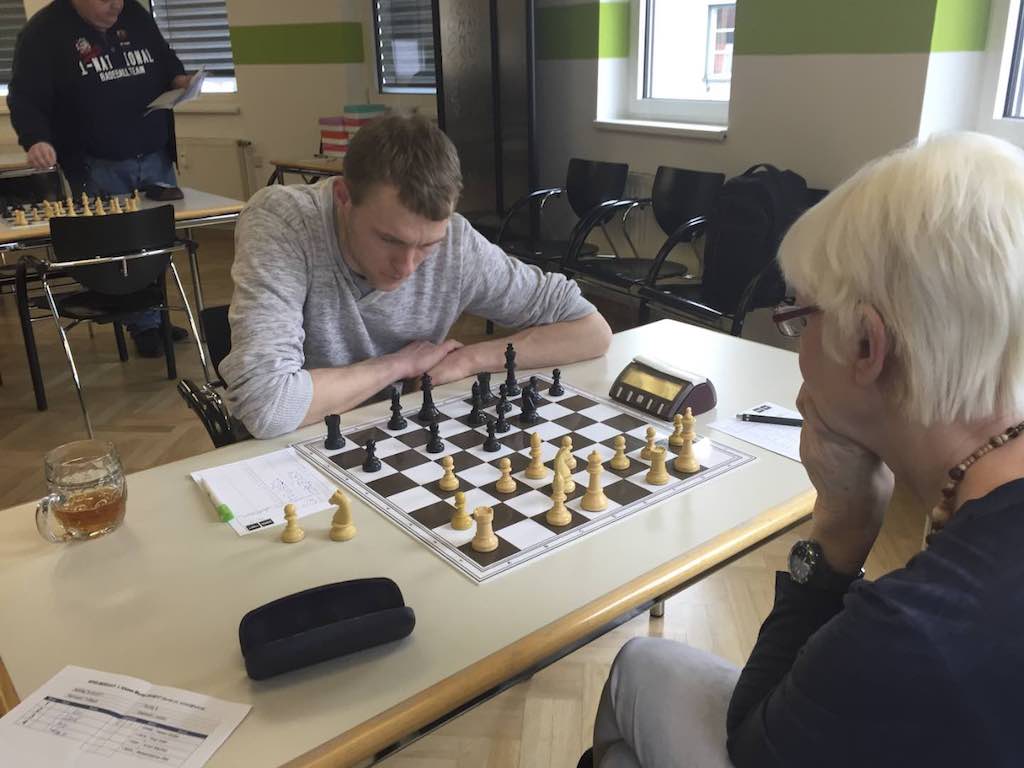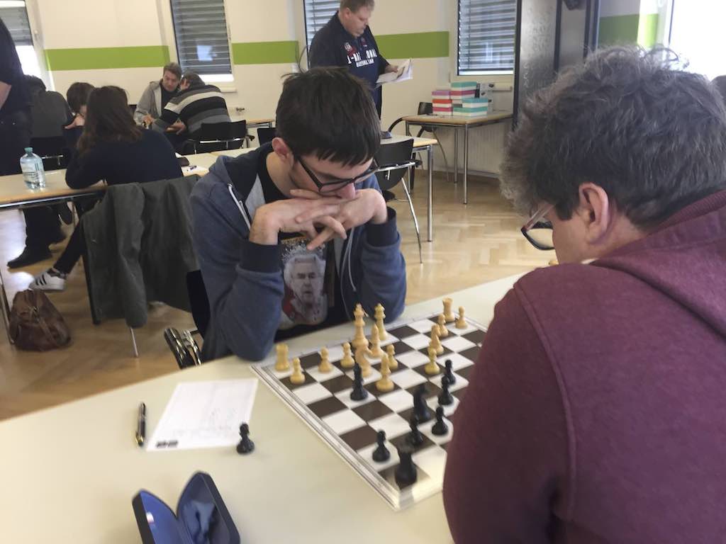 Georg Zeiler startete gleich aus der Eröffnung heraus einen stürmischen Angriff mit Figurenopfer. Es ergab sich aber für beide eine sehr zweischneidige Stellung und sie einigten sich auf Remis.